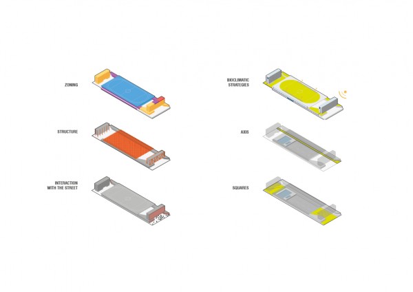 One site, two faces. Two possibilities of connection with the city. The concept ‘front x back’, ‘public x services’ was never an option. A longitudinal axis, accessible and inviting, connects the two faces – interfaces. Interfaces that despite the hierarchical distinction are equally necessary to the composition of the block, whose face today reveals the scars of our housing policy. Our city, our life. On the face of the buildings, the eyes of the city.