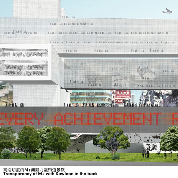 One of the key elements of OMA’s proposal for WKCD is M+, an experimental new museum interpreted as a barcode of overlapping bands featuring visual art, film, design and popular culture. Embedded in M+ is an Art Factory, where education, artist studios, a hotel and shops intersect and interact with the museum itself. Beneath M+, the Exhibition Centre is a venue for auctions and conventions, a further intermingling of culture and commerce. M+ links to Kowloon Park and to the surrounding neighbourhood with pedestrian bridges – one of them an extension of the park, one an extension of the museum itself – into Jordan and to Temple Street, and across Canton Road to an outpost of the museum in Victoria Towers.