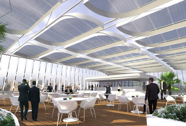 More with less has been achieved by the innovative integration of structure and environmental control systems. A façade of external fins controls solar gain and reflects light deep into the floor space, saving energy. The tower’s upper levels step back to give way to a spectacular rooftop cafe, complete with a solar harvesting open-air roof canopy. Optimized site boundaries, maximized plot coverage, adaptability for future proofing and efficient floor plate dimensions all combine to create a tower that is at once iconic, efficient and forecasts a strong future direction for the city.