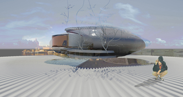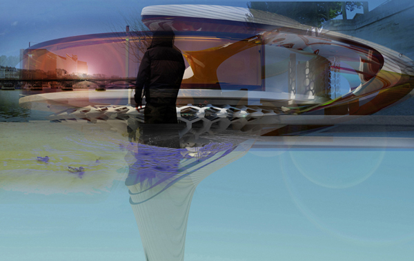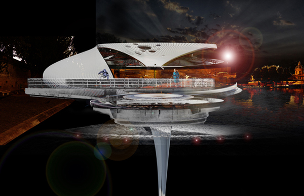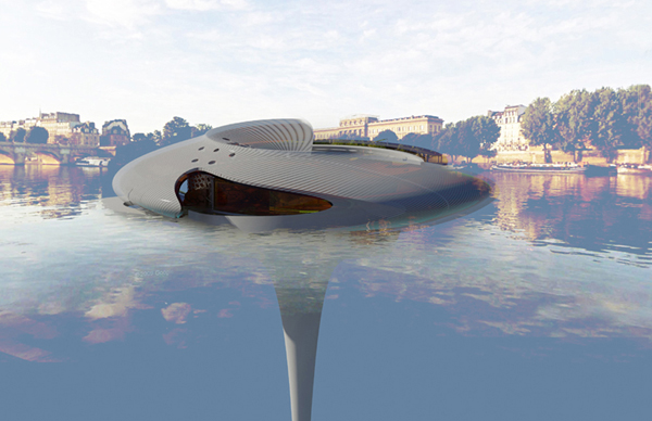 The pavilion bar designed by Margot Krasojevic is part of Paris’ flood control infrastructure. An enclosed circular glass bar rests over a bell mouth spillway which allows water to enter from it’s entire perimeter, directing the water throoughout the design, into the spillway.