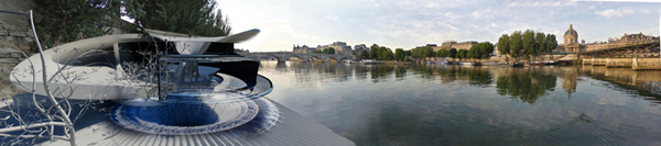 A lightweight composite fibre monocoque canopy covers the pavilion formed as a whirlpool to channel rainwater around it’s surface and into the spillway beneath it. Paris’ intircate and detailed manhole covers were the inspiration for the design.