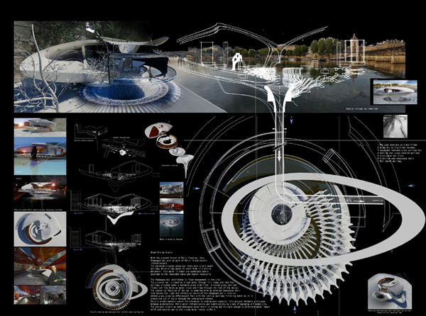 The circular bar is zoned to direct water through it’s ramps and into the spillway situated under a moveable glass clad floor. The industrial function of the bar is combined with an ethereal monocoque shell that houses the light and reflective nature of the pavilion bar’s interior, etched glass gives an effervescent feel with the lattice spillway filtering water as it is channelled through the underground network of submerged canals, upstream to the impounded lakes and nearby reservoirs.