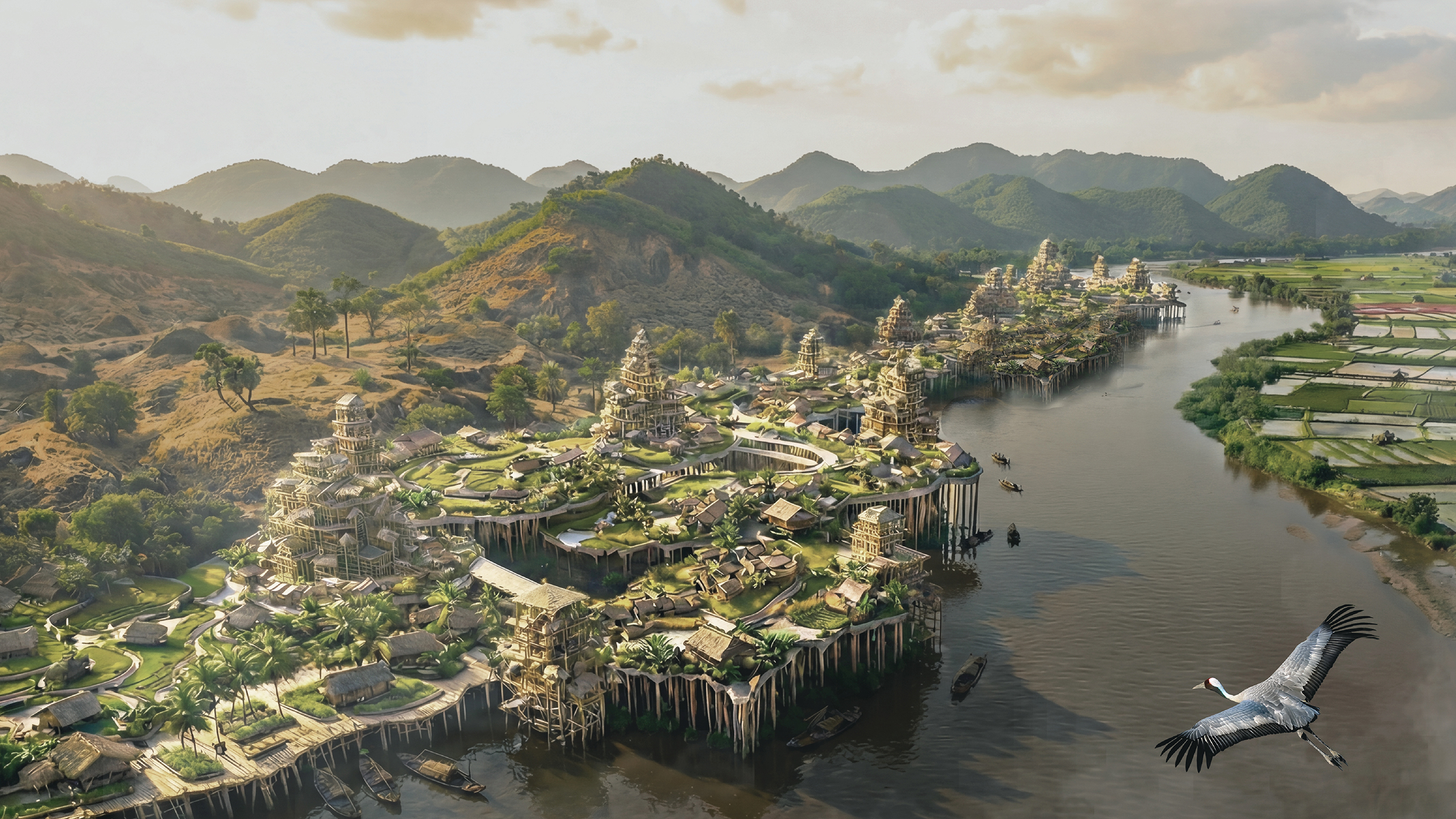 On the platform, clusters of modular timber-frame dwellings accumulate like small hills. Their composition draws directly from the silhouettes of surrounding mountains: platforms rise and fall in terraced layers, creating an inhabited topography that feels grown from the land rather than placed upon it. Homes step upward like miniature peaks, forming stratified neighbourhoods that mirror the logic of mountainous terrain. Roofs are oriented to catch breezes, shed monsoon rain, and cast deep shade. Terraces support small-scale farming, while shaded paths weave across the surface to form a continuous, walkable village shaped by both landscape memory and climatic necessity.