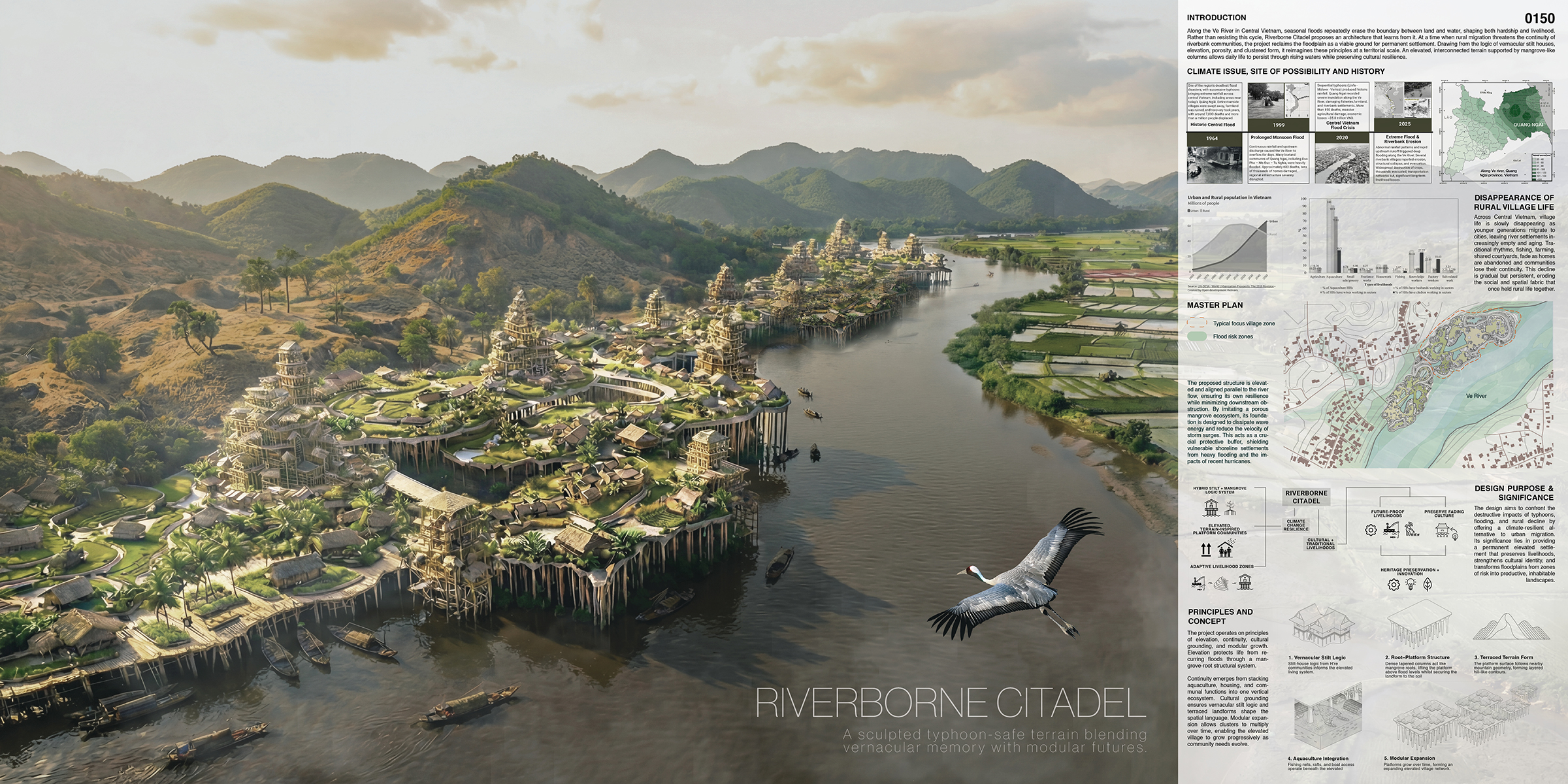 Riverborne Citadel then proposes a new architectural organism for the floodplains of Central Vietnam, an elevated, continuous terrain rising above the Ve River while remaining inseparably linked to the ground and water systems that sustain local life. Neither tower, bridge, nor conventional megastructure, it operates as an inhabited canopy: a suspended landscape shaped by climate, culture, hydrology, and ecology functioning as one.