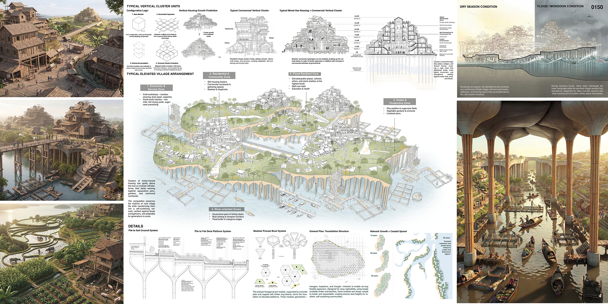 Above the riverbank, the project forms a gently undulating sky-ground whose profile echoes the nearby mountain ranges. This elevated terrain rests on a dense field of stilt columns inspired by mangrove root systems. The root-like supports combine durable shafts for flood resistance with lighter branching structures for permeability and low-maintenance repair. Integrated vertical access cores allow fishermen, farmers, and residents to move directly from water or land to the elevated village. At water level, aquaculture zones, fish rafts, and docking platforms strengthen existing river economies without obstructing natural flows.