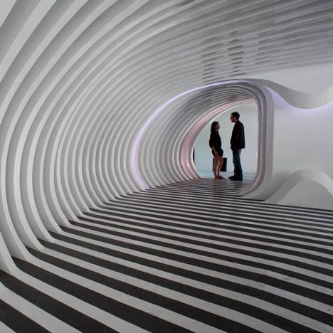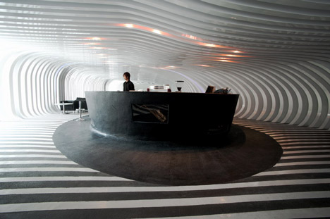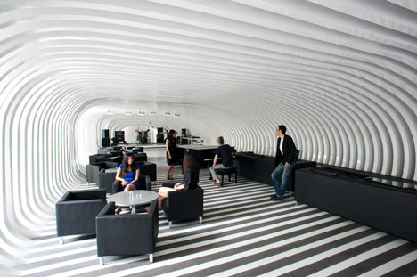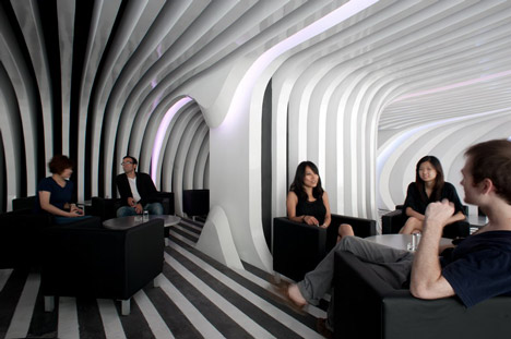 The design, says the architect, is “a caved space formed from of a digital Boolean subtraction of hundreds of slices from an amorphic blob.” A byproudct of the age of 3-D computer modeling programs, the Zebar is a “digital design created in an analogic world,” Gatti said.