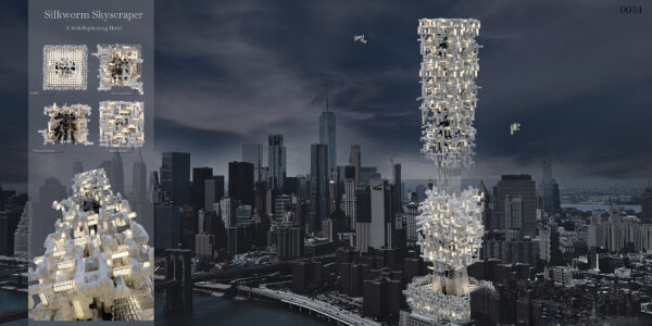 The general geometry of the hotel skyscraper is derived from a standing cube like a silkworm cocoon suspended to create diverse and experimental spatial qualities. Silkworm cocoon fiber composites with white color and elliptical shape as a replicable structure provide the possibility to expand the hotel in horizontal and vertical dimensions, if desirable, without the need for land demolition and new constructions.