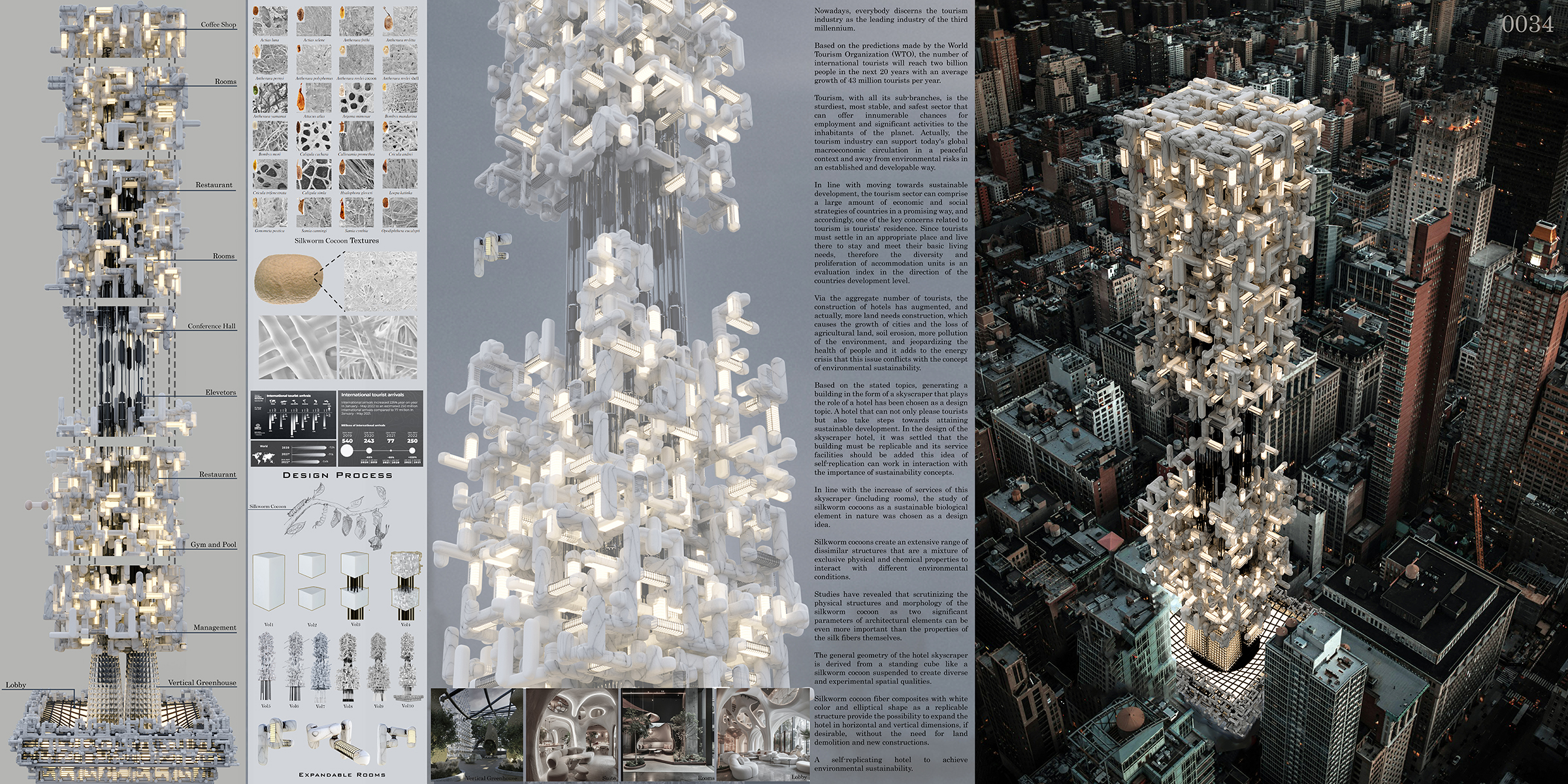 The general geometry of the hotel skyscraper is derived from a standing cube like a silkworm cocoon suspended to create diverse and experimental spatial qualities. Silkworm cocoon fiber composites with white color and elliptical shape as a replicable structure provide the possibility to expand the hotel in horizontal and vertical dimensions, if desirable, without the need for land demolition and new constructions.