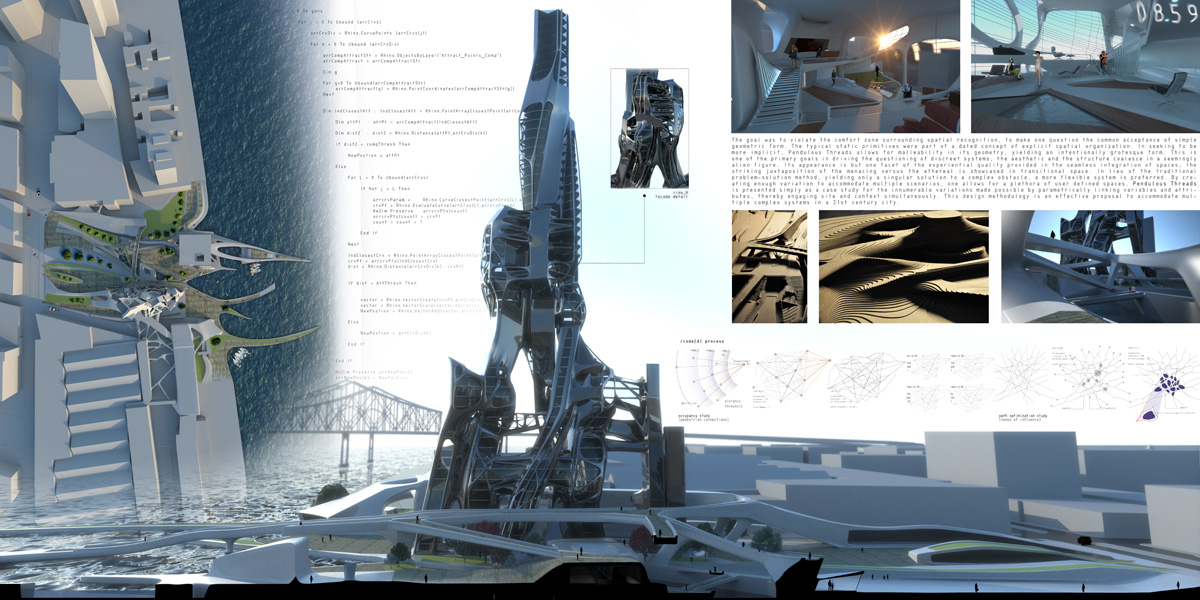 In lieu of the traditional problem-solution method, yielding only a singular solution to a complex obstacle, a more flexible system is necessary. By creating enough variation to accommodate multiple scenarios, one allows for a plethora of user-defined spaces. We present Pendulous Threads simply as a case study for the innumerable variations made possible by parametrically linking variables and attributes, thereby engaging site and context simultaneously. This design methodology is an effective proposal to accommodate multiple complex systems in a 21st century city.