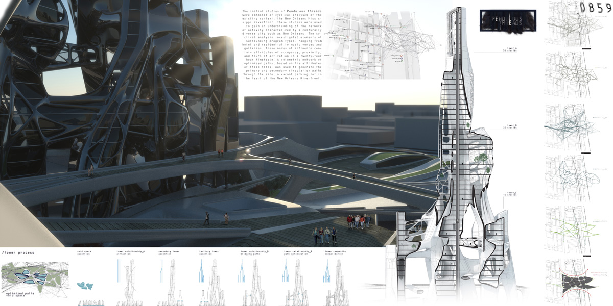 Our goal was to violate the comfort zone surrounding spatial recognition, to make one question the common acceptance of simple geometric form. The typical static primitives were part of a dated concept of explicit spatial organization. In seeking to be more implicit, Pendulous Threads allows for the malleability in its geometry, yielding user-determined spaces in an intentionally grotesque form. This is one of the primary goals in the questioning of discreet systems; the aesthetic and the structural coalesce in a seemingly alien figure. Its appearance is but one facet of the experiential quality provided in the seamless integration of elements; the striking juxtaposition of the menacing versus the ethereal is showcased in interior spaces, against the backdrop of the New Orleans skyline.