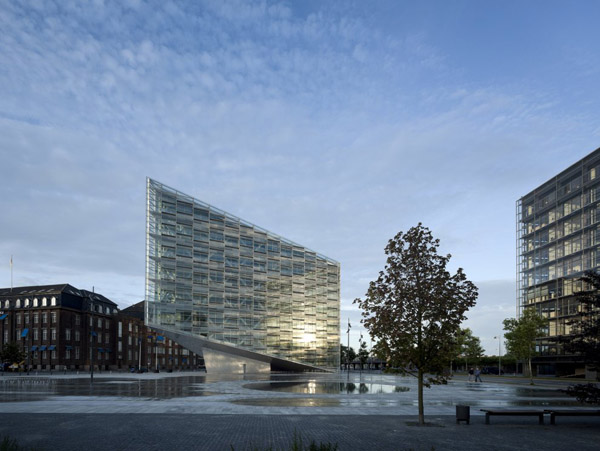 The piazza features a large water pool which reflects the sun and the clouds moving across the sky. The Crystal and the Cloud are designed to interact with their surroundings, offering a subtle connection between the formal architecture of the Glyptotek Museum of Ancient and Modern Art, and the waterfront area which forms the setting for the new building.