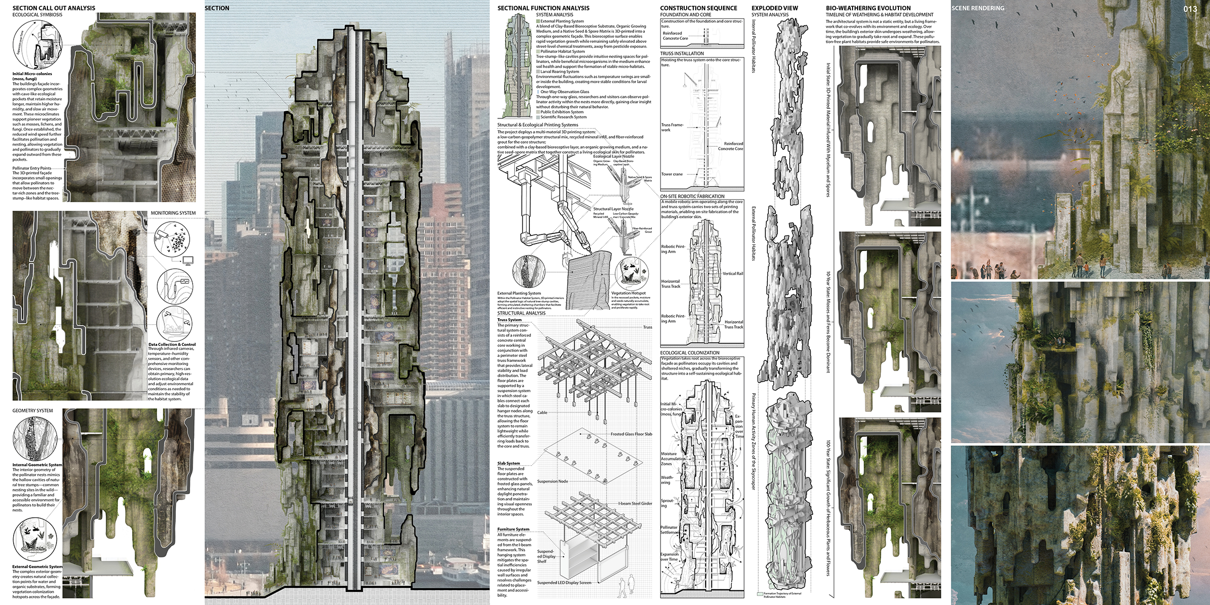In its mature state, The Living Refuge becomes a site of ecological colonization and symbiosis. Vegetation takes root across the façade, microorganisms enrich the substrate, and pollinators occupy the interior cavities—forming a dynamic, evolving network of habitats. Positioned far above pesticide exposure and insulated from ground-level habitat fragmentation, the skyscraper operates as a regenerative ecological engine for Manhattan.