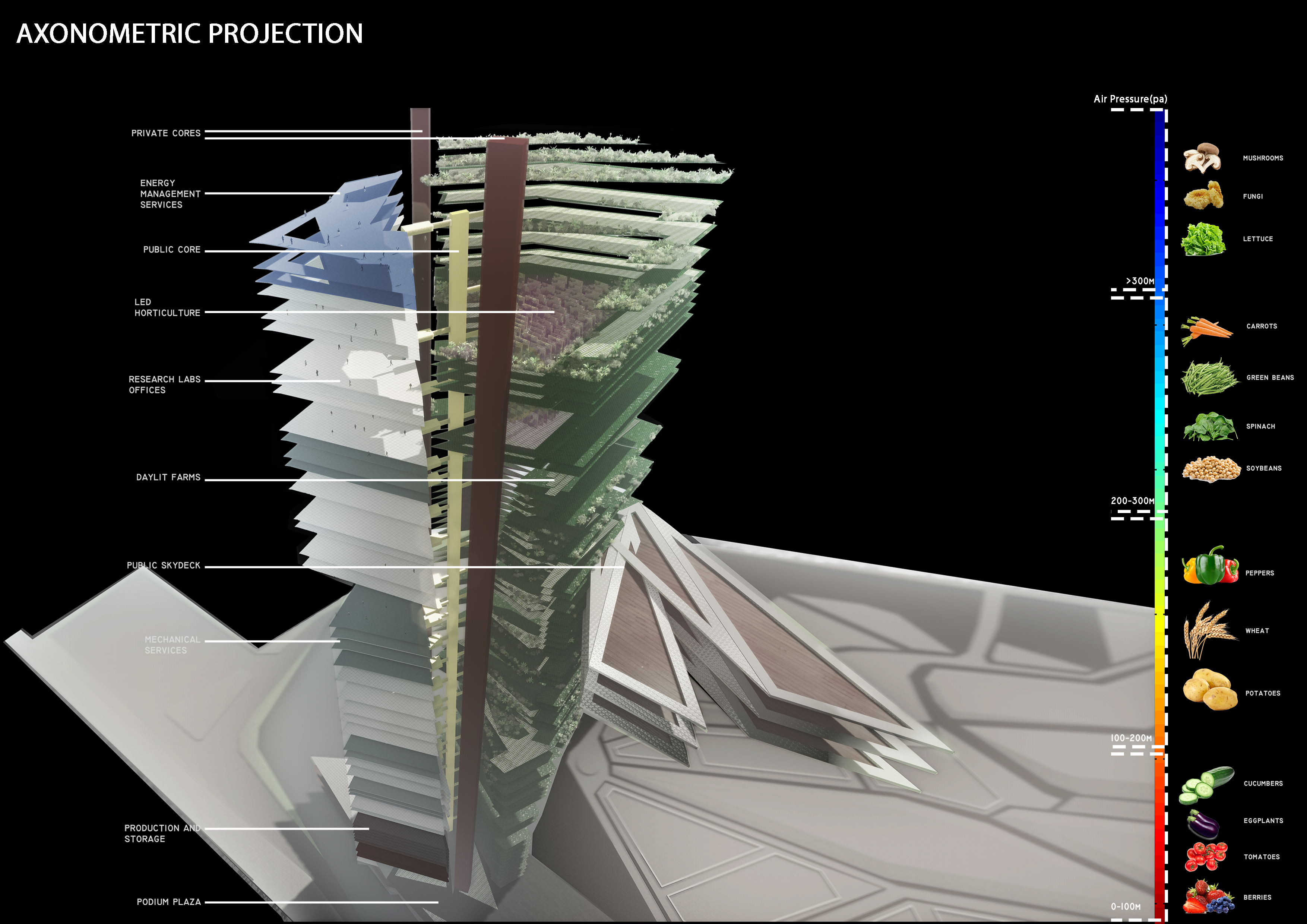 The proposal sets forth to approach the vertical farming typology in a whole new perspective. I wanted to do something different compared to most other vertical farm precedents and proposals. I believe that vertical farming can be something more than just a stacked up farming typology.