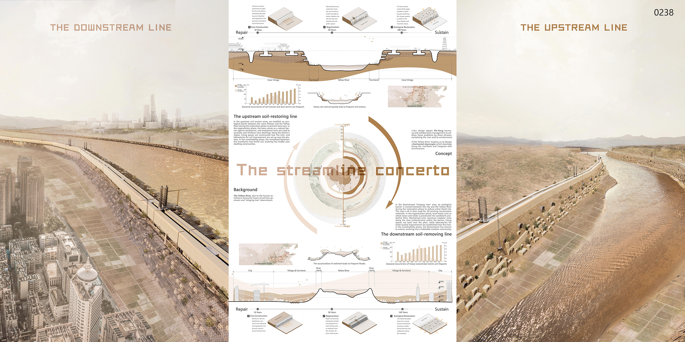 This design focuses on the environmental challenges of the Yellow River, addressing soil erosion upstream and the ‘hanging river’ phenomenon downstream. It adopts a philosophy of Yin-Yang harmony and collaborative management to comprehensively tackle these issues, aiming to achieve natural balance and soil-water improvement. We aspire that, in three 50-year cycles, through phases of restoration, regeneration, and sustainability, the architecture will blend into nature, and the sandstorms will be effectively controlled, soil in the upstream will no longer be lost, and the Loess Plateau will flourish; the riverbed downstream will be reduced to a safe level, turning the ‘hanging river’ into history. People will no longer fear the Yellow River’s breaches flooding cities, and the river will once again be the life-sustaining Mother River. We consider that skyscrapers may not develop vertically and could have a more diverse definition which means if necessary, skyscraper can extend in any certain direction. The twisty form of the Yellow River inspires us to design a skyscraper which develops along the riverbank and integrate with the natural environment, aiming to solve the ecological problem of the Loess Plateau.
