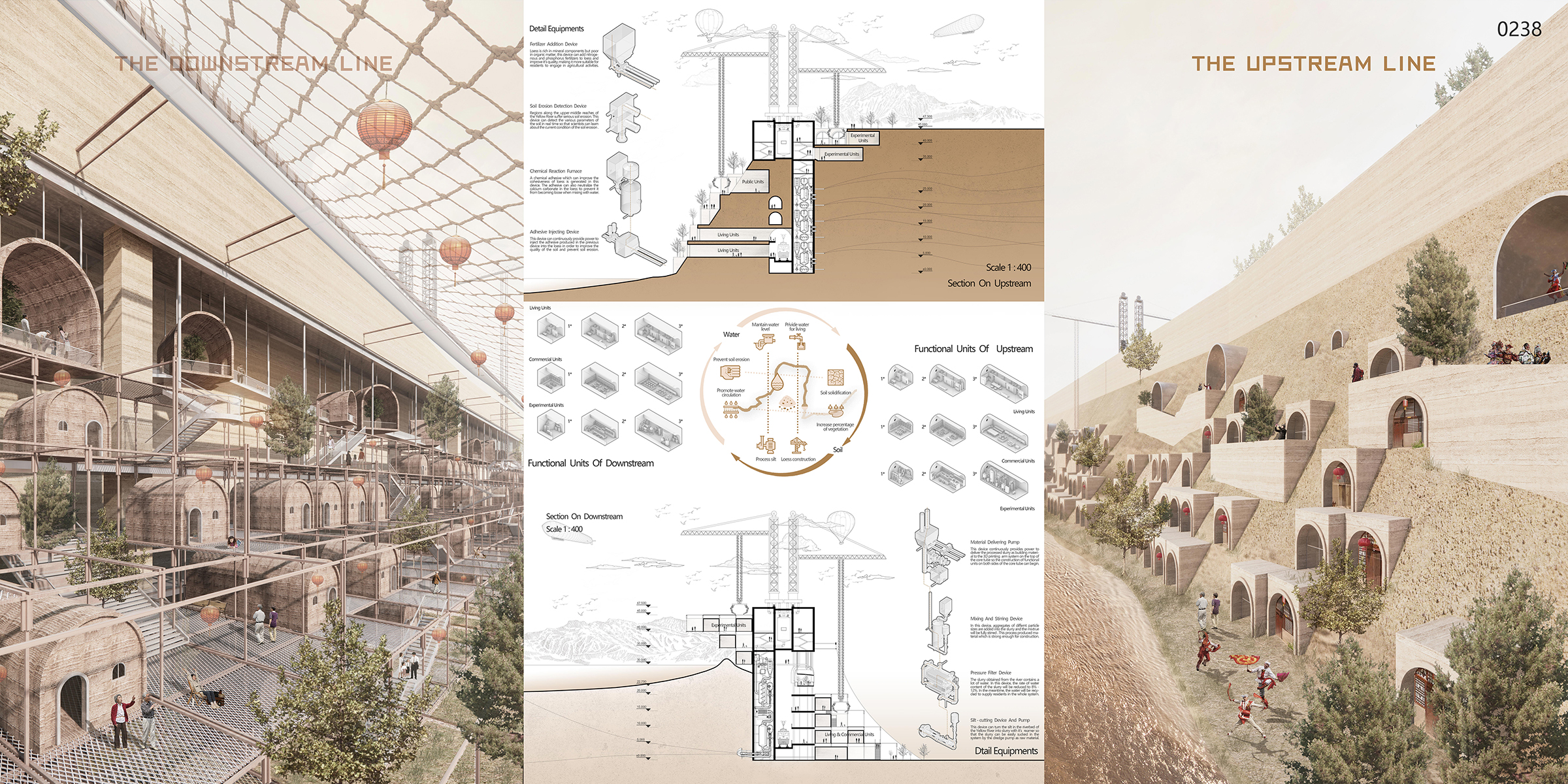 In the upstream soil erosion areas, during the restoration phase, an ecological barrier is established between the Loess Plateau and the Yellow River to prevent further loss of loess. In the regeneration phase, the loess itself is used as a protective layer against sandstorms. Mechanical arms are employed to excavate and reinforce cave dwellings on both sides of the ecological barrier’s loess slopes. On the side closer to the Yellow River, living spaces for the population are constructed, while on the side closer to the Loess Plateau, laboratories for improving the quality of the loess soil are established. In the sustainability phase, the completed Upstream line will return to nature as fertile soil, evolving into habitable cave dwelling communities.
