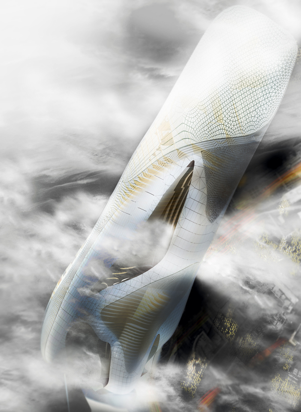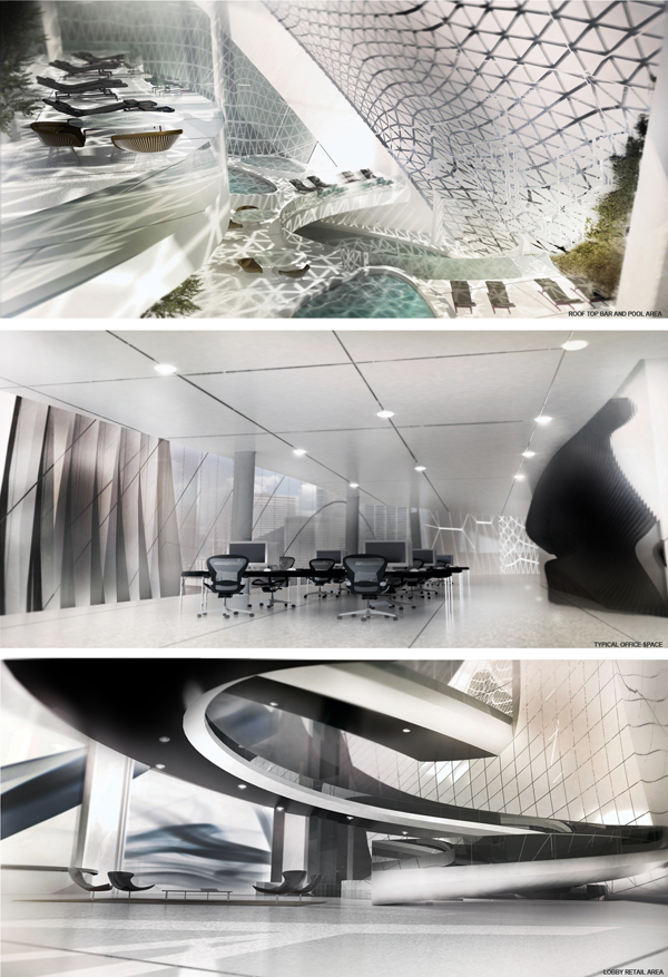 The Relief Tower is designed around environmental conditions from a parametric mind-set while using rules of analysis to govern design choices. Located in the River North area of Chicago, the Relief Tower will be able to generate power to several neighboring buildings as well as a triple zero goal for itself. The form was generated by computational fluid dynamic analysis, as well as large physical models that underwent wind tunnel analysis. The animalistic (amphibious) form was manipulated to push wind into the outer, non-habitable, wing like extremities, that house vertical wind turbines. The funneling conditions in the outer extremities, push the wind faster towards the inset turbines, as well as push air towards the atrium. The energy created through this technique not only powers the towers own-self, but many neighboring buildings. Conservation of energy in the Relief Tower is one of the many factors and goals for itself. The outer skin of the tower creates a screening effect that protects itself from outside elements, as well as creating a play with shadows to the people within. The outside skin opens and closes due to sun radiation and changing elevation in relationship to program (using parametric alterations in the metals’ properties). The tower accommodates offices for a third of the tower as well as luxury hotels for the remaining levels, with a rooftop sky bar/pool area for attendees.