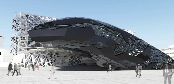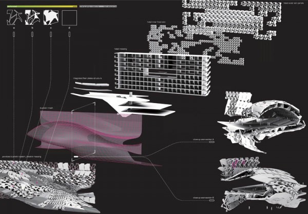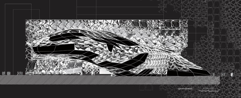 Clean geometry and multiple levels of specificity were favored. Going through several iterations that manipulated scale, geometric flow, twisting, shearing, panel types, depth variations and different surface geometries, the team investigated the extent in which the script could adapt in creating a complex and versatile skin for the project.