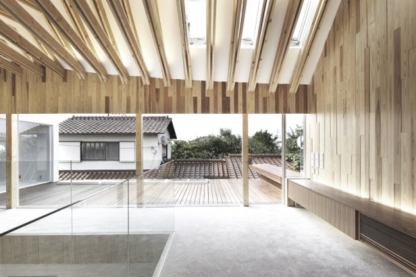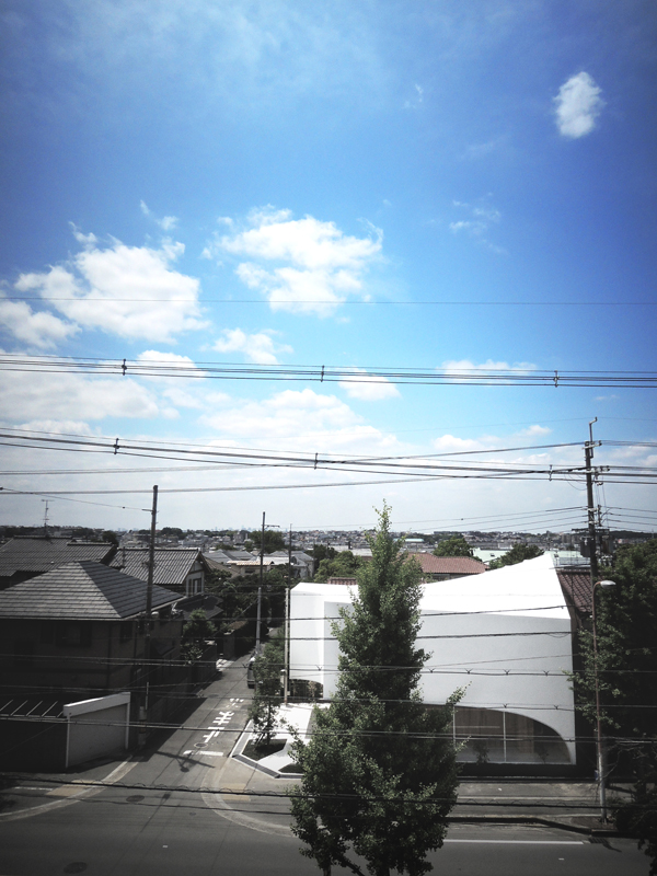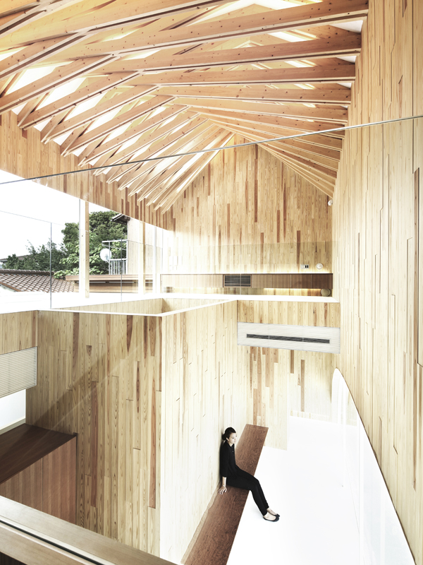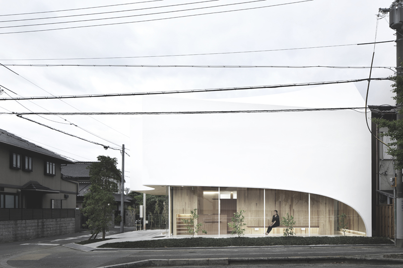 Orientation and shape of the surrounding residential influenced the silhouette of the structure’s west elevation. Gable roof that blends in the neighborhood transforms like drawing an arc towards the west side as its movement shows modernism. To give a warm impression to the exterior facade, natural materials of wood are used, where walls stand as a white canvas that complements cherry blossoms during its season.
