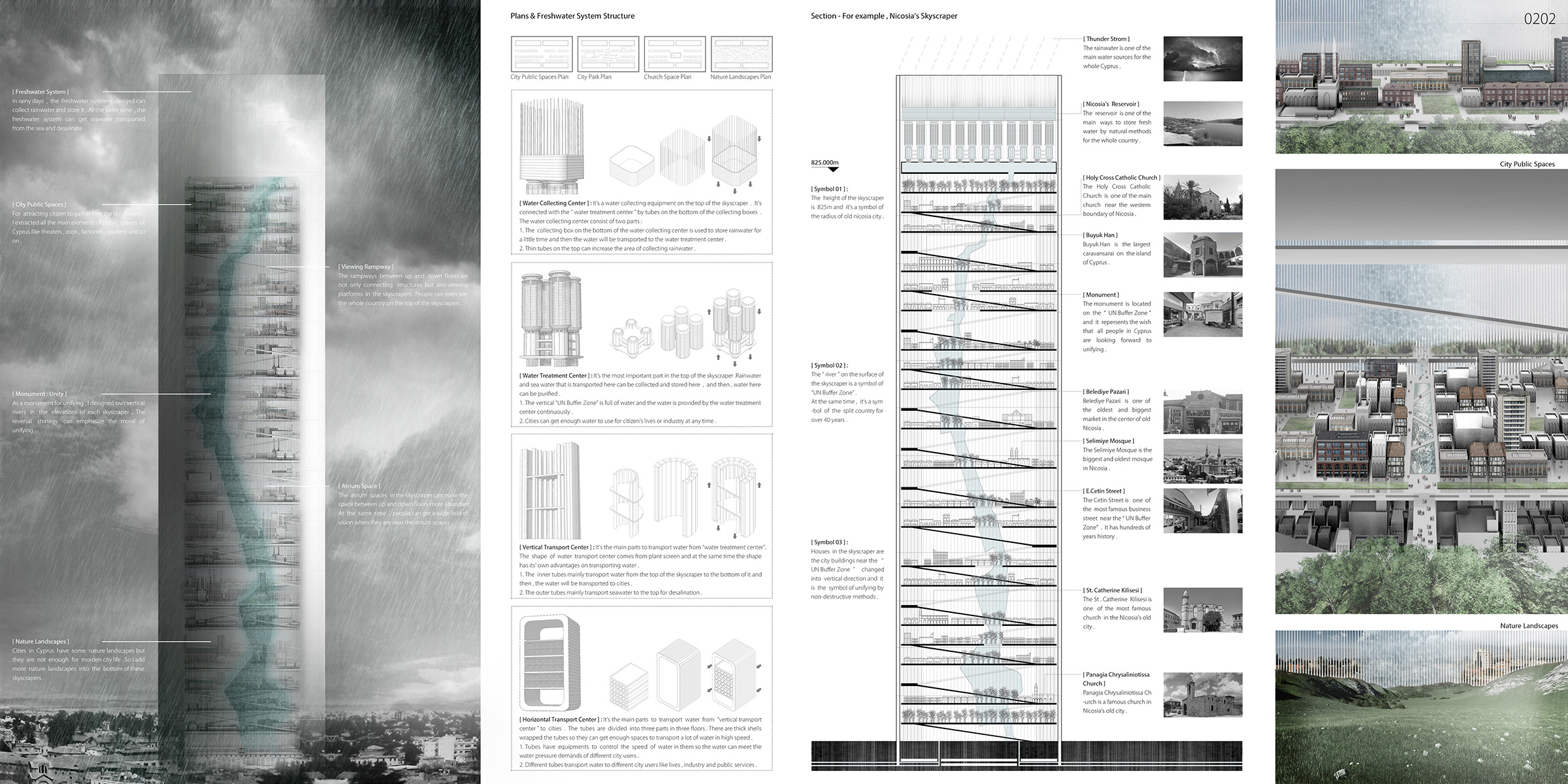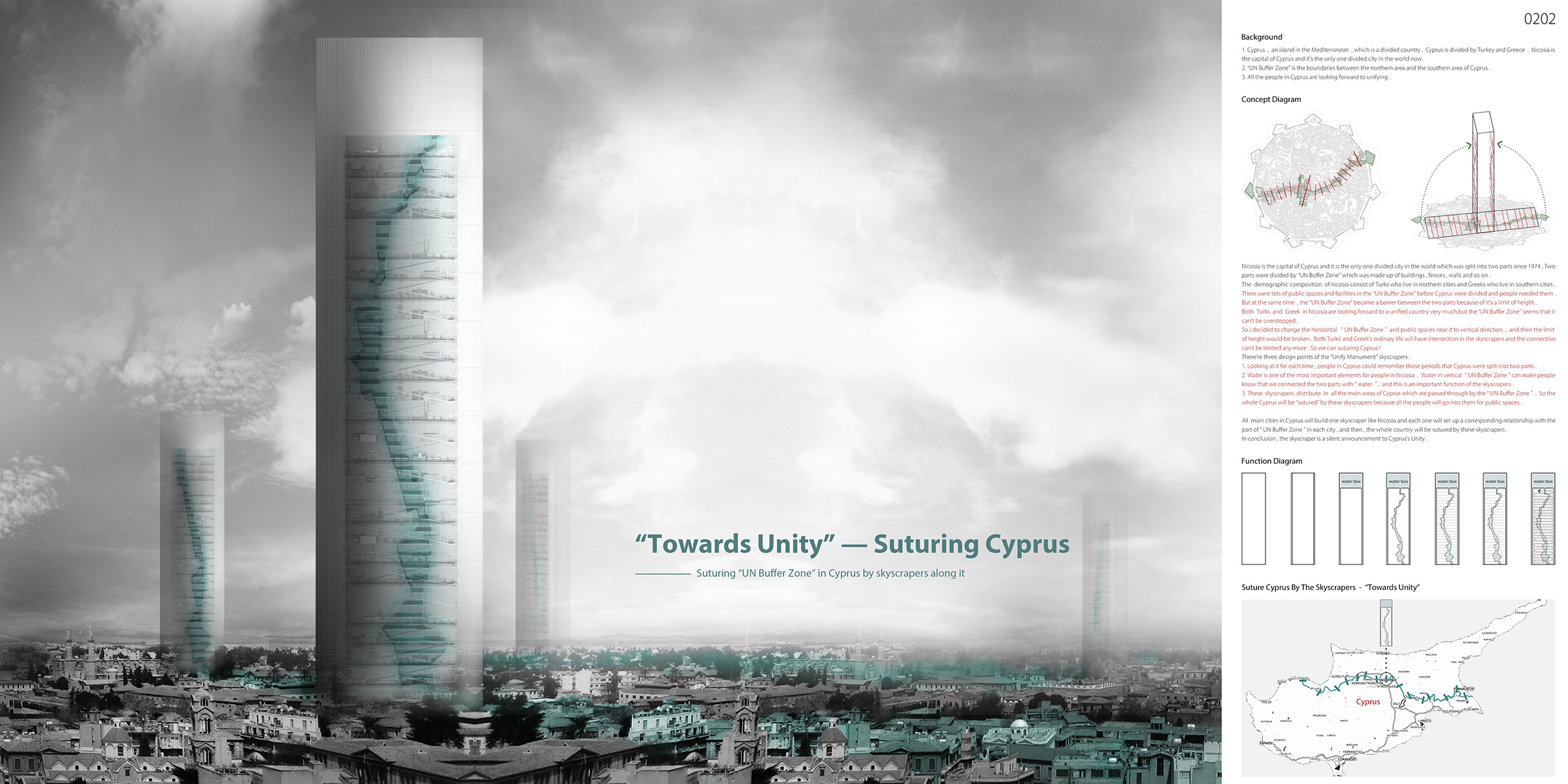 There are three design points of the “Unify Monument” skyscrapers: 1) Looking at it for each time, people in Cyprus could remember those periods that Cyprus were split into two parts. 2) Water is one of the most important elements for people in Nicosia. Water in vertical “UN Buffer Zone” can make people know that we connected the two parts with “water”, and this is an important function of the skyscrapers. 3) These skyscrapers distribute in all the main areas of Cyprus, which are passed through by the “UN Buffer Zone”. So the whole Cyprus will be “sutured” by these skyscrapers because all the people will go into them for public spaces. All main cities in Cyprus will build one skyscraper like Nicosia and each one will set up a corresponding relationship with the part of “UN Buffer Zone” in each city, and then, the whole country will be sutured by these skyscrapers.