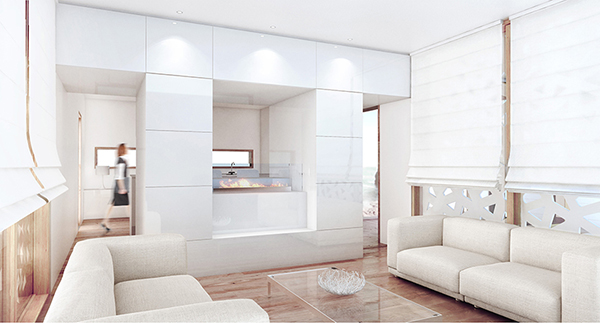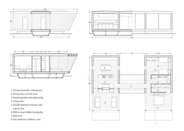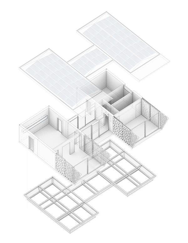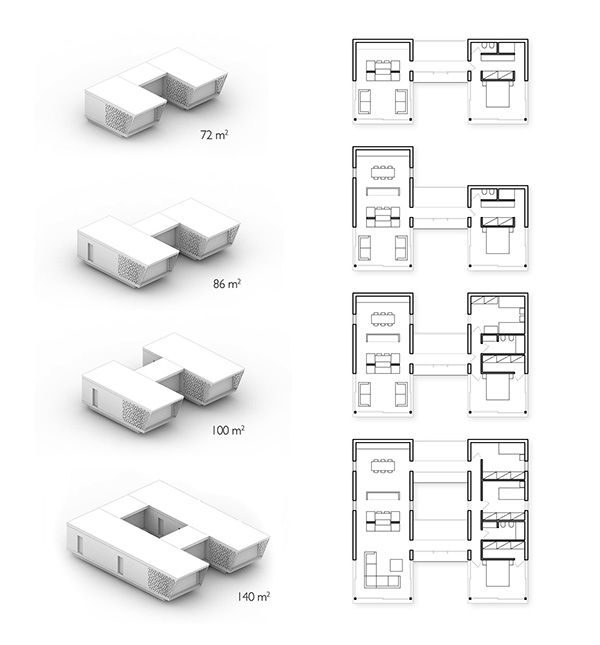 Architecture duo Micaela Colella and Maurizio Barberio designed Unboxed, a prefab wooden home that can be completely recycled. Unboxed is based on the typical Mediterranean house and represents a more sustainable alternative to masonry or frame structure buildings. The high standardization of the modules and their total prefabrication creates great flexibility. This goal is also achieved by splitting the building in several basic structural elements designed to be mounted with all the finishes and without thermal bridges. Thanks to an innovative foundation made of steel, which reduces or eliminates the need for excavation, the house is 100 percent recyclable and can be removed from the site. A low inclination roof allows for the installation of solar roof tiles capable of producing electricity and heat. The house also has a clear division between the living and the sleeping area with a glazed corridor/entrance in the middle that allows residents to re-establish contact with the surrounding environment (flow of time) during each passage.