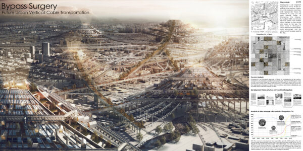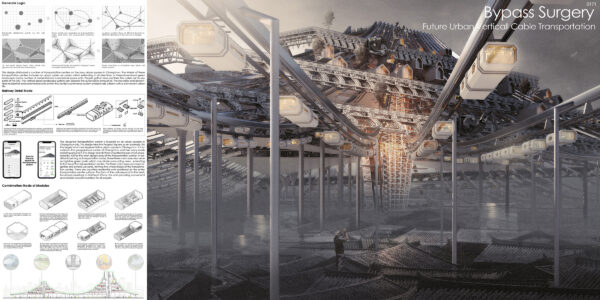 This design distributed a number of transportation centers in the busy urban squares in Changchun. The interior of these transportation centers includes an urban cable car system that extends in all directions, a three-dimensional green landscape, and a number of residential and commercial space units. People gather here and take the cable car to any parts of the city. The vertical green landscape system can absorb the automobile exhaust air. The movable and detachable residential and commercial units enrich the center’s commerce system and provide citizens with a convenient urban life.