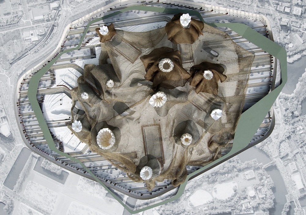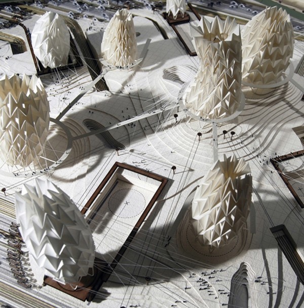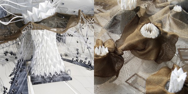 These characters have been replaced and transformed into architectonic metaphors creating an Urban Theatre within the grounds of the Imperial Palace in central Tokyo. The Princess, a flexible, diaphanous knitted membrane, envelopes the spaces below and is fabricated using the surrounding Igusa rush to knit itself ever larger in aim to reach the grass parkland perimeter representing the Cowherd. Linked within this skin is a series of enormous folded plate lung structures. These origami lungs of the Emperor expand and contract creating the sensation of life. The lungs, deployed around the site act as physical barriers that manipulate the knitted skin as it extends towards the outer parkland, these manipulations are controlled and articulated by the Emperor’s army using a series of complex pulley systems which pull back the lungs and the surrounding skin.