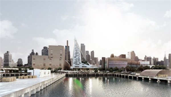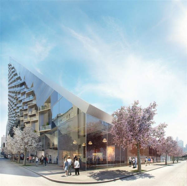 The slope of the building allows for a transition in scale between the low-rise structures to the south and the high-rise residential towers to the north and west of the site. The highly visible sloping roof consists of a simple ruled surface perforated by terraces—each one unique and south-facing. The fishbone pattern of the walls are also reflected in its elevations. Every apartment gets a bay window or a balcony to amplify the benefits of the generous view and balconies which encourage interaction between residents and passers-by. DFR commissioned Copenhagen based BIG in the spring of 2010 to introduce a new residential typology to Manhattan. As of 2011 BIG has opened a new office in New York in order to oversee the development and upcoming construction of West 57th.