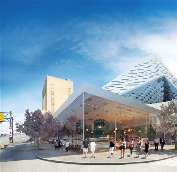 The form of the building shifts depending on the viewer’s vantage point. While appearing like a warped pyramid from the West-Side-
