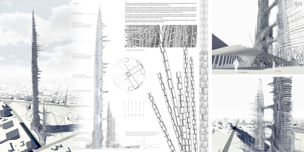 The shape that shoots upwards out of the ground creates a crystallized appearance with help of high technologies. The architectural image is developed to answer the most vital needs of city dwellers.