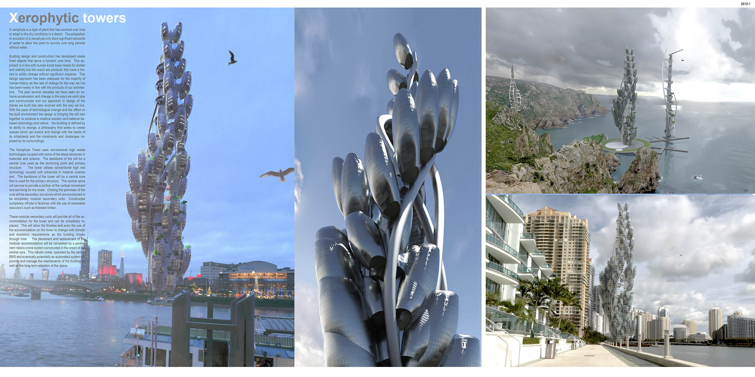 The Xerophyte Tower uses conventional high reside technologies coupled with some of the latest advances in materials and science. The backbone of the will be a central core used as the anchoring point and primary structure.