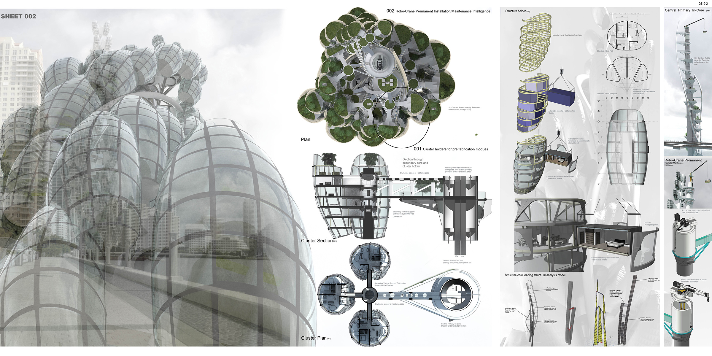 These modular secondary units will provide all of the accommodation for the tower and can be completely replaced. This will allow the finishes and even the use of the accommodation on the tower to change with climatic and economic requirements as the building moves through time. The placement and replacement of the modular accommodation will be completed by a permanent robotic crane system constructed in the crown of the central core. This robotic crane, operated by the central BMS and eventually potentially an automated system will provide and manage the maintenance of the building as well as the long-term adaption of the space.